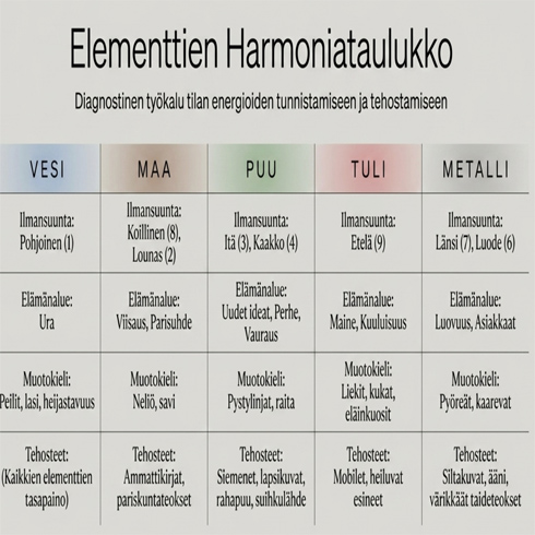 - Kuinka elementit liittyvät elämänalueisiin (ura, ihmissuhteet, perhe, näkyvyys, luovuus)