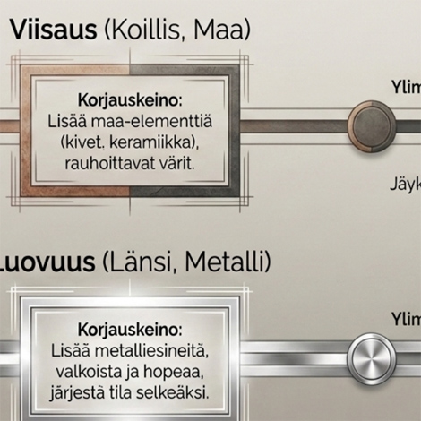 Materiaali toimii sekä diagnostiikkatyökaluna että korjaavana oppaana. Keskiössä on ajatus selkeydestä: ennen kuin lisäät mitään, vapauta tila. Kun tukokset poistetaan ja elementit ovat tasapainossa, energiavirtaus paranee ja arki alkaa tuntua kevyemmältä ja johdonmukaisemmalta.